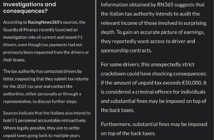 - F1车手因税务问题站在刑事犯罪边缘,补税与罚款仅是起点,部分人可能面临行业禁入;