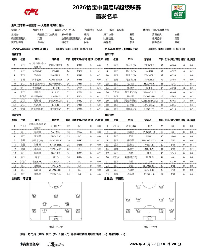 今晚(北京时间4月22日晚)19时35分,2026年中超联赛第7轮的一场辽宁同省德比在斥巨资改造后画虎不成、依然无法达到专业足球场效果的沈阳铁西体育场上演,来自足球城的大连英博海发做客省城,对决被强行冠以新辽足、但其实是沈阳队的辽宁铁人。