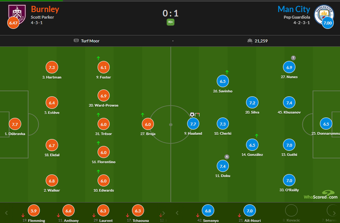 本场比赛曼城在客场创造出了非常多有威胁的进攻机会,但是临门一脚的表现不佳,好在哈兰德开场闪击得手,帮助球队打入全场唯一进球,最终1-0击败伯恩利,在积分榜上超越阿森纳登顶。