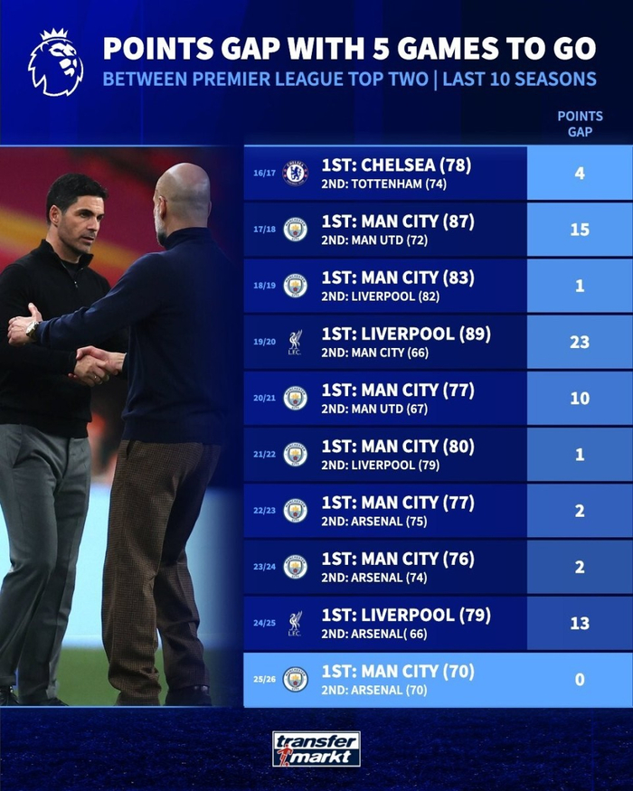 根据德国转会市场的统计数据,在最近10个赛季的英超比赛中,本赛季是在33场比赛过后前两名球队分差最小的一次,此前的最大分差曾达到23分。