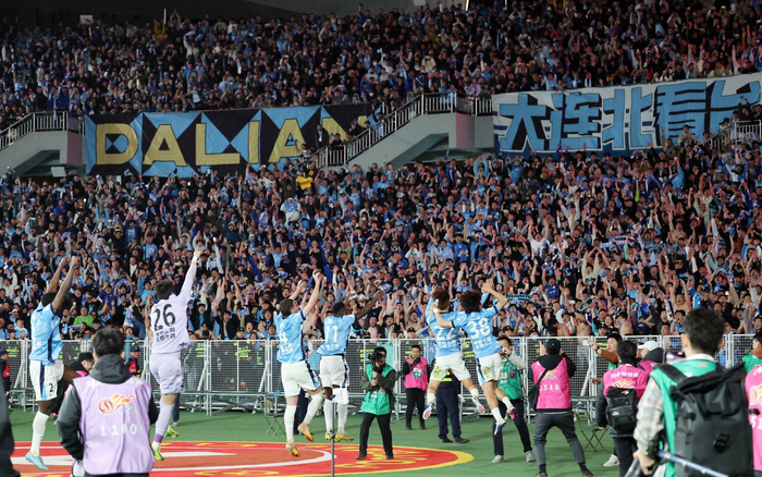 赛后大连英博球员跑向家乡球迷跃起庆祝,图片中可以看到吕焯毅、毛伟杰、马莱莱、斯坦丘、黄子豪、马马杜等。