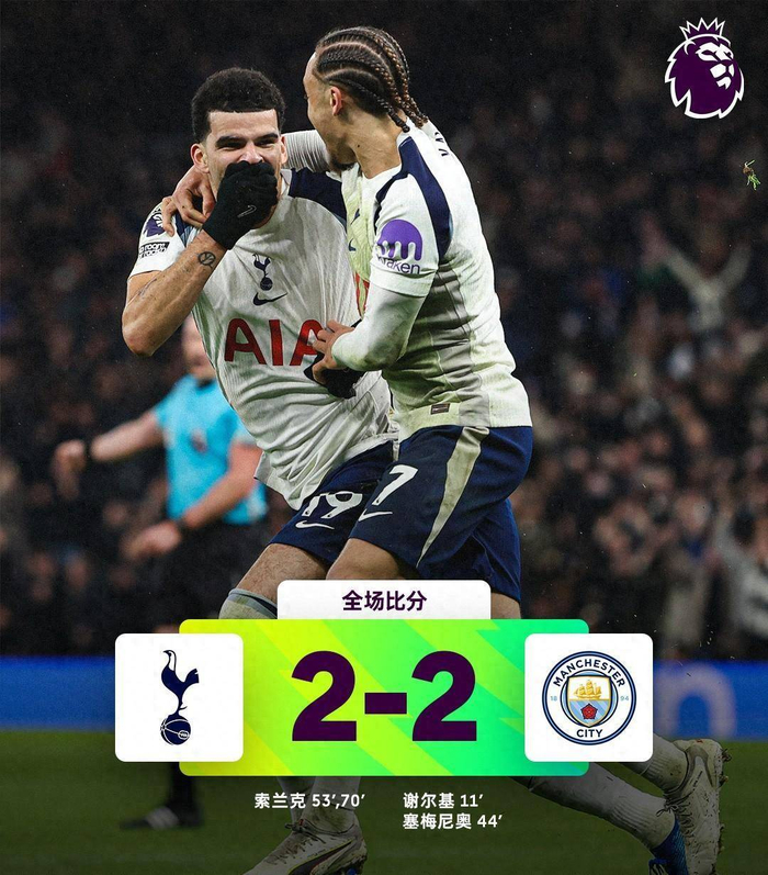 不过下半场情况完全变了。第53分钟,西蒙斯用外脚背挑传,索兰克撞开胡桑诺夫,然后一脚扫射,球打在格伊腿上弹进网窝,热刺终于扳回一球!到了第70分钟,加拉格尔右路突破后传中,索兰克用蝎子摆尾式的脚后跟破门,这球太精彩了,热刺直接把比分扳平了!最终双方2比2握手言和。