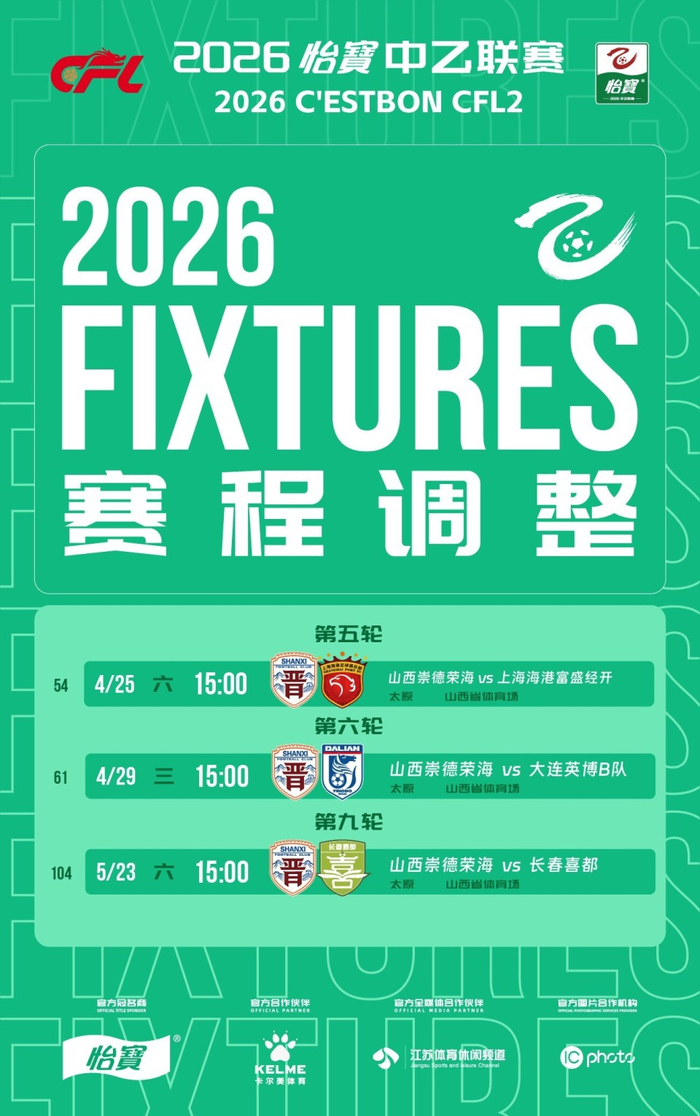 因原体育场无法继续使用,经山西崇德荣海足球俱乐部、山西省足球协会共同申请,山西省体育局来函同意,并协商客队同意,现决定调整2026怡宝中乙联赛山西崇德荣海的部分主场比赛场地,比赛日期和开球时间不变。