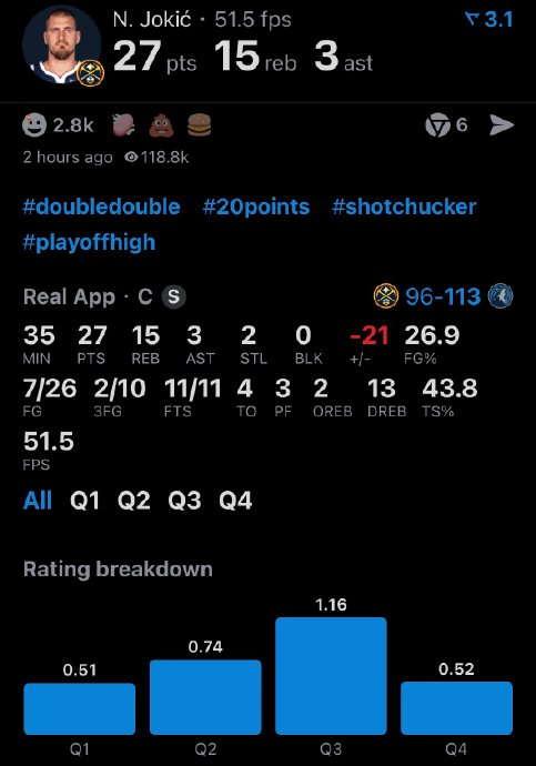 森林狼本场祭出联盟顶级的防守策略:单兵封锁+轮转协防。戈贝尔全场如影随形缠斗约基奇,迫使后者首节8投1中、末节7投1中,整场效率暴跌至26.9%,并送出3记封盖(其中2次直接封堵约基奇)。更致命的是,森林狼坚持不夹击策略,切断约基奇与队友联系,使其传球创造力锐减(仅3次助攻),同时全队快速轮转限制穆雷,导致掘金后场核心17投5中仅得16分。约穆组合合计43投12中,命中率不足三成,正负值低至-21,彻底陷入“单打困局”。