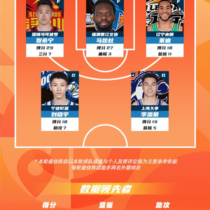 2025-2026赛季CBA联赛常规赛第42轮结束较量,来自@深圳新世纪烈豹篮球俱乐部 的@贺希宁Hunter3 ,@福建浔兴SBS男篮 的马昆杜,@辽宁沈阳三生飞豹篮球俱乐部 的莱迪,@宁波富邦町渥男篮 的@刘晓宇 和@上海久事大鲨鱼官方微博 的@李添荣Tr 入选CBA联赛常规赛第42轮最佳阵容!