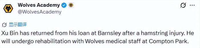 2026年4月25日,据狼队青训官方消息,中国球员徐彬此前在巴恩斯利租借期间遇到了腿筋伤病问题,目前已返回狼队基地,正在医疗团队的监督下进行康复训练。虽然此前曾有消息说,徐斌受伤会影响他的留洋生涯,甚至还出现了“徐彬将离开英国返回中超踢球”的传闻,但从目前英国传来的最新消息来看,徐彬会继续在英国留洋,不会马上回归中超。