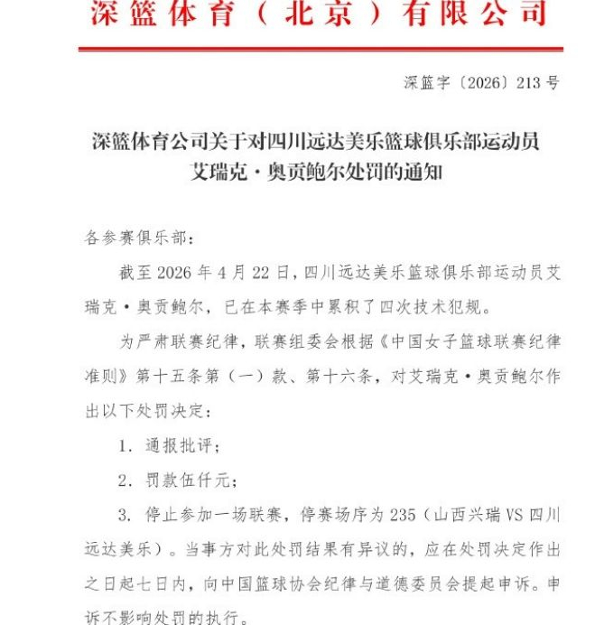 WCBA罚单:奥贡鲍尔4T禁赛罚5千 坎贝奇伤停四川女篮剩单外援