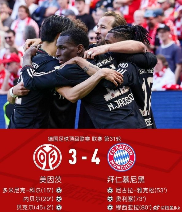 2026年4月25日,德甲第31轮上演史诗级逆转——提前夺冠的拜仁慕尼黑客场0-3落后美因茨,却在短短半场连轰4球实现“让三追四”,以4-3的比分书写了德甲历史上最疯狂的翻盘剧本之一。
