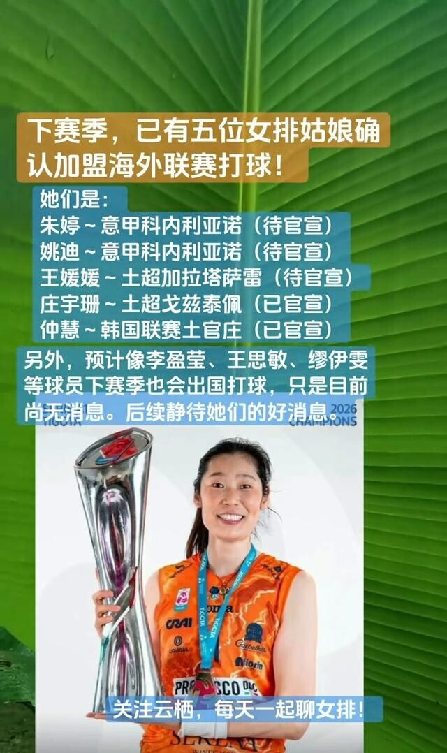 她们是:朱婷~意甲科内利亚诺(待官宣);姚迪~意甲科内利亚诺(待官宣);王媛媛~土超加拉塔萨雷(待官宣);庄宇珊~土超戈兹泰佩(已官宣);仲慧~韩国联赛土官庄(已官宣)。