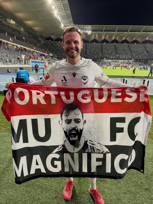 北京时间4月26日,曼联官方社媒晒出一张前曼联球员、现效力于澳超墨尔本胜利队的胡安-马塔,手持现任曼联队长布鲁诺-费尔南德斯的旗帜的照片。