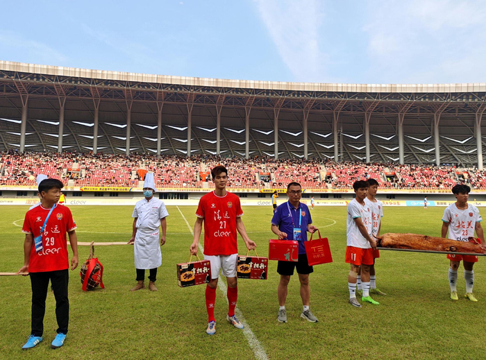赛场之外尽显粤北城市情谊。中场休息期间,清远队尽显东道主诚意,拿出烧猪、盐焗清远鸡、英德红茶等本地特色美食款待客队韶关队。韶关队同样礼尚往来,回赠堆花米酒、宰相粉等本土非遗特色物产,一场足球赛事成为清远、韶关两座粤北城市文化交流、双向联谊的纽带。