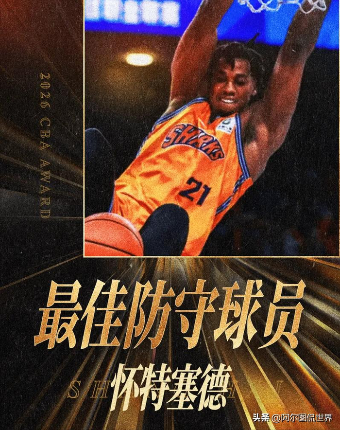 CBA官方宣布:上海球员哈桑-怀特塞德当选本赛季最佳防守球员。
