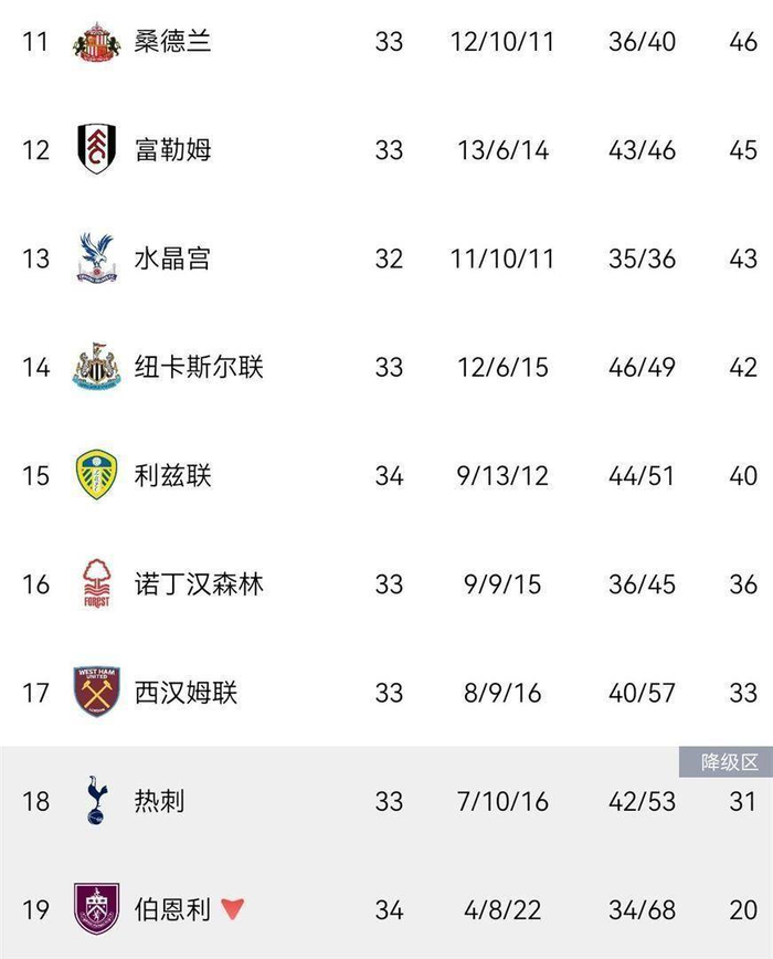 对于伯恩利来说,这场失利是致命的。 输球后他们依然只有20个积分,在联赛仅剩4轮的情况下,落后安全区13分。 他们成为本赛季继谢菲尔德联之后,第二支确定降级的英超球队。
