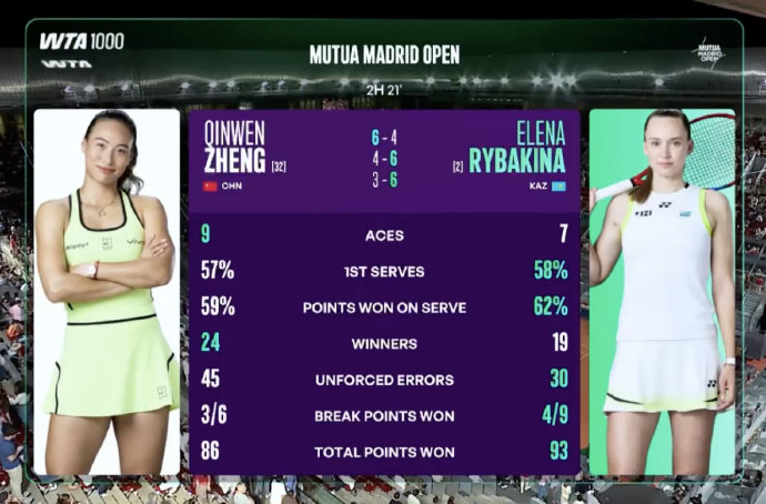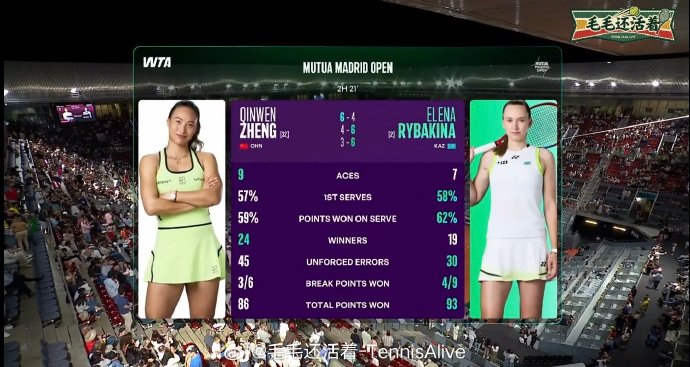 3. 对手战术乘势调整:莱巴金娜借此局逆转士气,调整为降速保一发的稳健策略,限制郑钦文进攻空间。