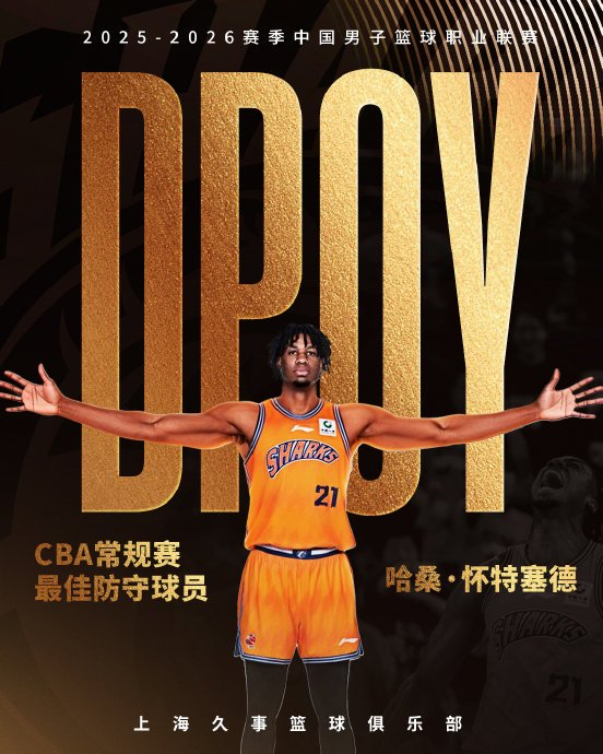 怀特塞德成为CBA自2018-19赛季设立最佳防守球员奖以来,首位获奖的外援,终结了易建联、周琦、沈梓捷等本土球员的7年垄断。