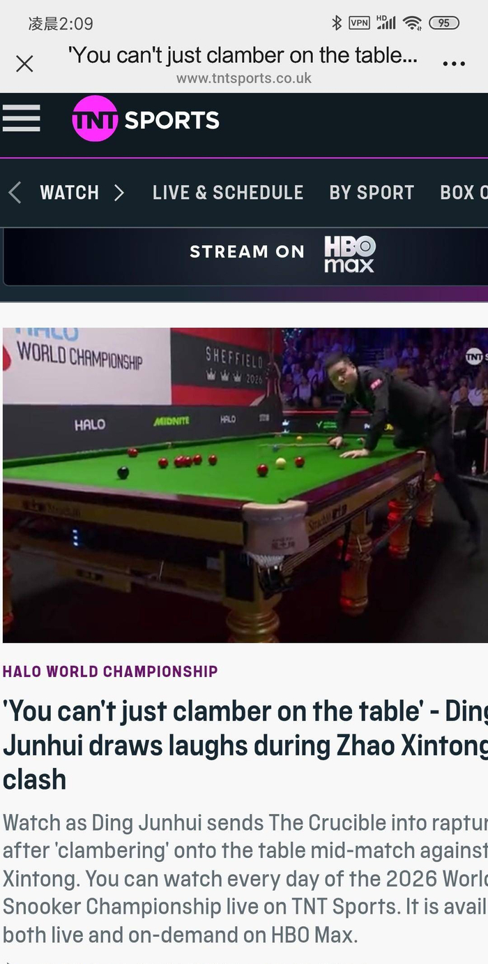 英国TNT Sports报道了一则有趣的画面:在丁俊晖对阵赵心童的比赛中,丁俊晖一个“不按常理出牌”的动作让全场都笑翻了。报道里还特别提到,丁俊晖这种轻松自在的态度,让人觉得他其实挺享受比赛,没有想象中那么紧张。