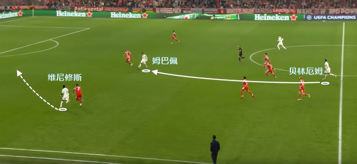 姆巴佩则相反,他需要的是锋线队友来给他传球,所以韦尼休斯不得不远离球门,通过更多的强突来吸引防守注意力,给弧顶的空位姆巴佩“喂饼”。
