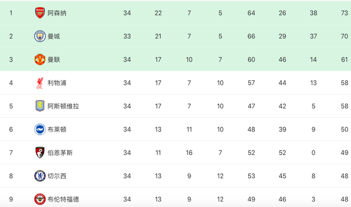 而在联赛剩余4轮的情况下,第3名的曼联积61分,已经领先第6名布莱顿11分,欧冠资格已经非常接近锁定。