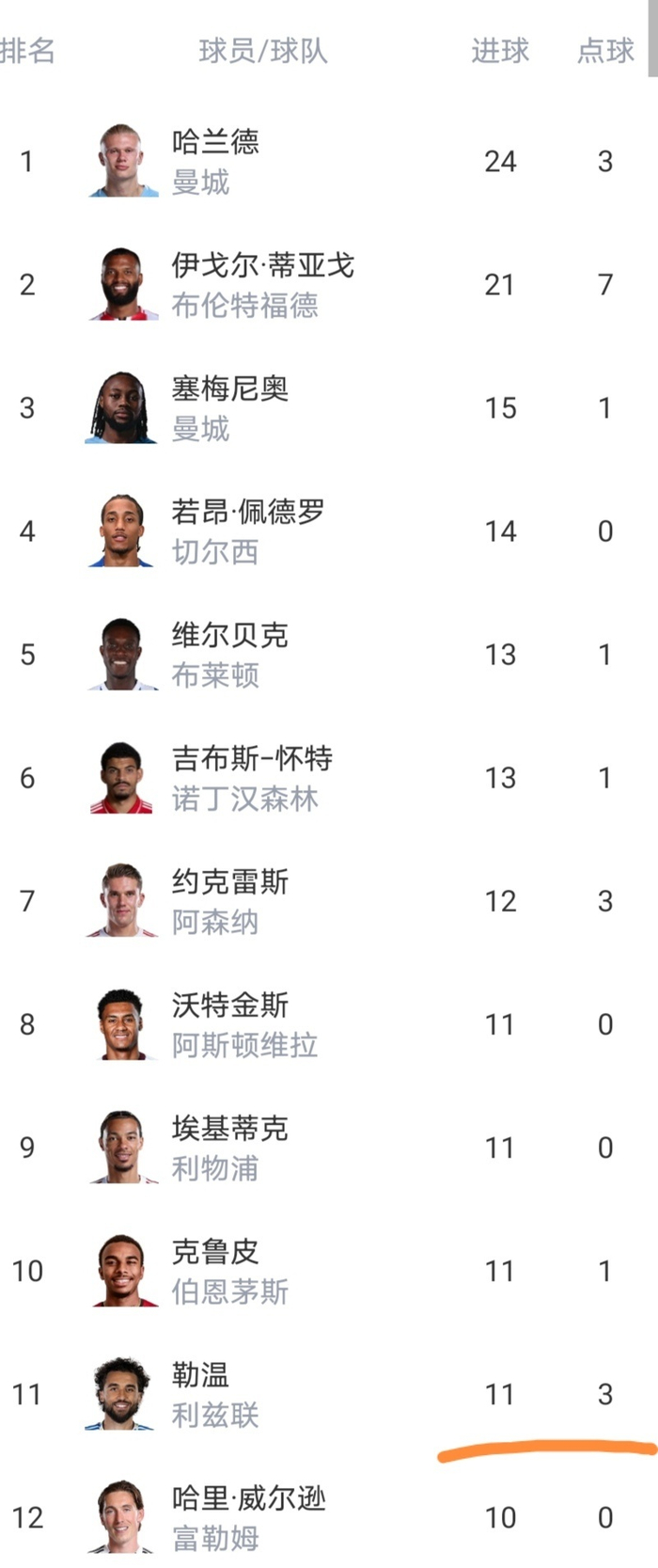 射手榜前十没有曼联的球员。