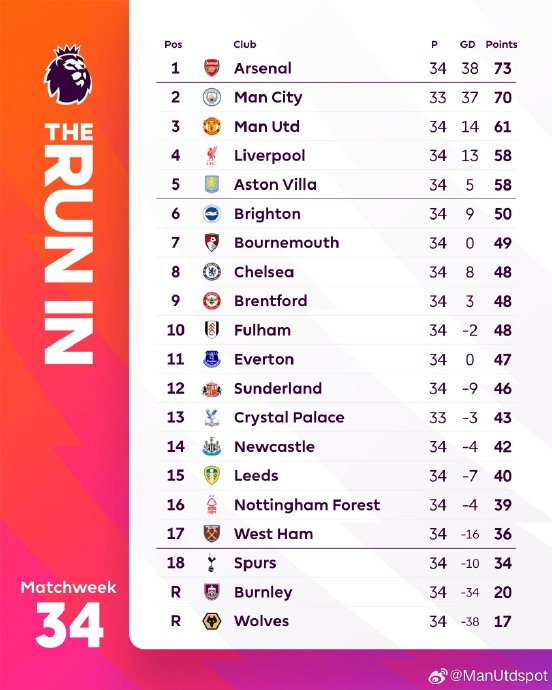 英超即时积分榜上,34轮过后曼联比第六名布莱顿多11分。