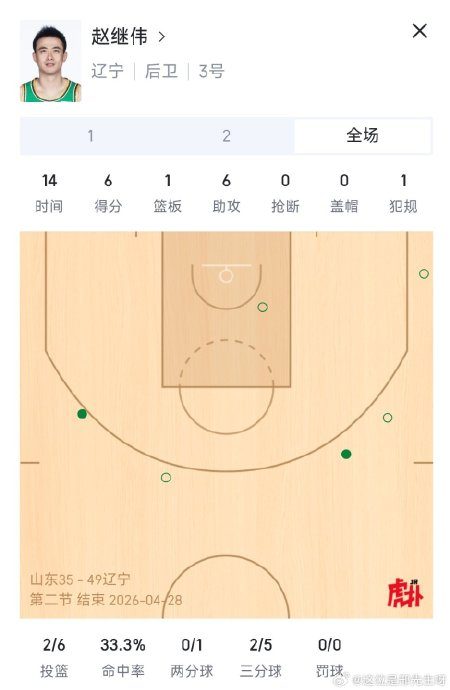 在辽宁男篮客场对阵山东高速的季后赛关键战役中,赵继伟上半场出战13分钟,交出10分5助攻的答卷。他投篮3投2中(命中率66.7%),罚球5罚全中,并命中一记三分球。尽管个人出手次数不多,但他在场期间球队净胜分高达+15,而替补休息的6分钟内辽宁反而净输1分,其控场价值可见一斑。