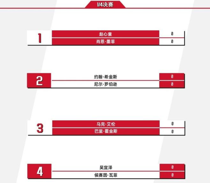 上半区:赵心童vs肖恩·墨菲、希金斯vs尼尔·罗伯逊