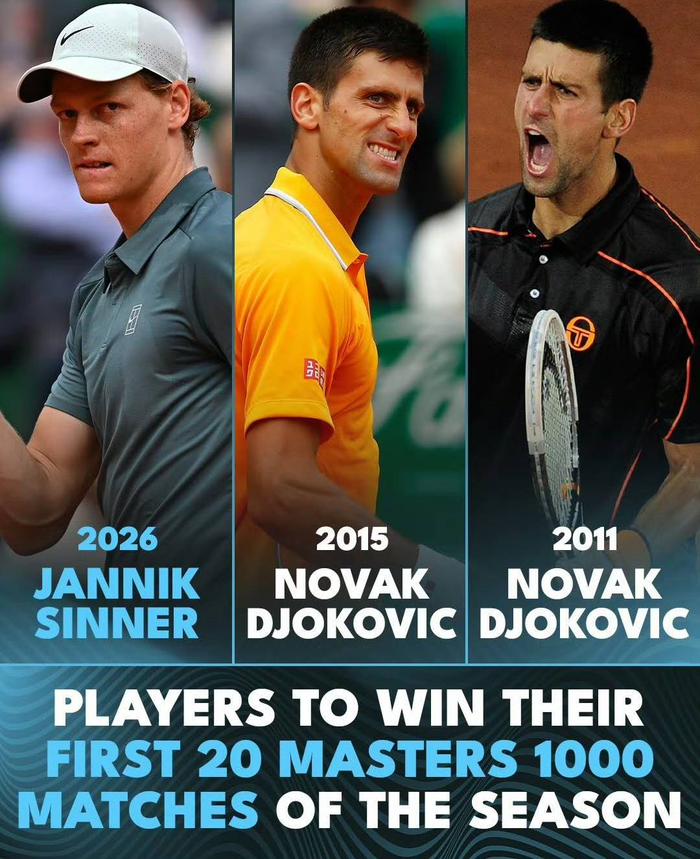 凭借这场胜利,辛纳成为男子网坛历史上第二位在单个赛季开局阶段豪取大师赛20连胜的球员。在他身前,只有德约科维奇曾两度完成这一神迹——2011年和2015年。考虑到本赛季辛纳已连夺印第安维尔斯与迈阿密两站大师赛冠军,马德里若能登顶,他将进一步拉大与世界第二的积分差距。