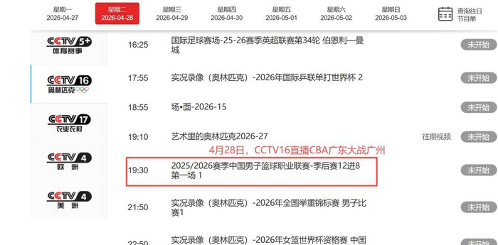 央视今天直播安排出炉了,而且还做了调整!CCTV5今晚19点30分会提前5分钟开始转播CBA季后赛,山东男篮对阵辽宁的比赛。而广东对广州这场比赛,则是安排在CCTV16奥运频道直播。大家记得看啊!
