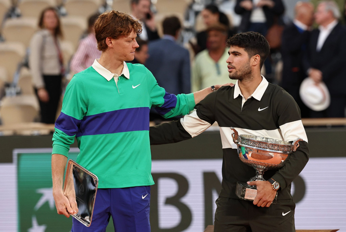 2025年法网,阿尔卡拉斯(右)夺得男单冠军,辛纳(左)夺得男单亚军
