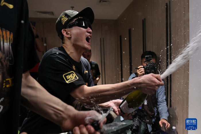 5月20日,浙江方兴渡队球员孙铭徽在更衣室喷洒香槟庆祝夺冠。
