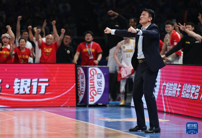 5月20日,浙江方兴渡队主教练王博(前)在场边庆祝球员命中三分球。