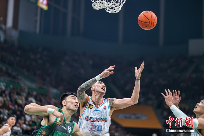 3月31日晚,在辽宁沈阳进行的2024-2025赛季中国男子篮球职业联赛(CBA)常规赛第四十六轮比赛中,辽宁本钢队在主场辽宁体育馆迎战山东高速队。最终,辽宁本钢队116:90胜山东高速队。图为山东高速队球员陶汉林(中)在比赛中拼抢。中新社记者 于海洋 摄