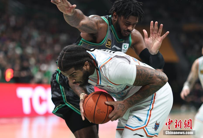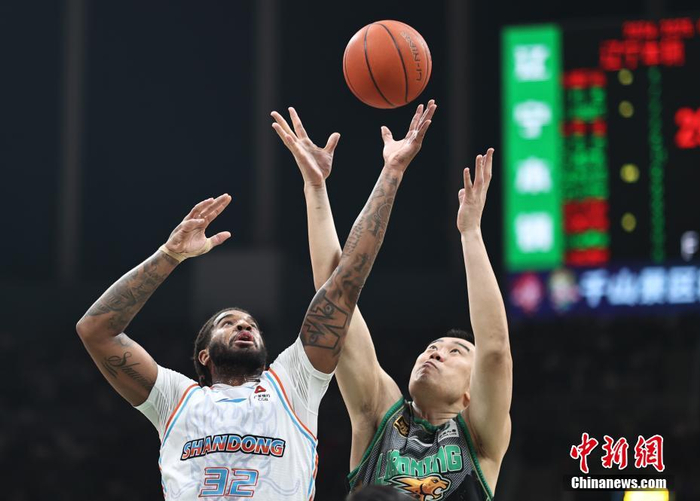 3月31日晚,在辽宁沈阳进行的2024-2025赛季中国男子篮球职业联赛(CBA)常规赛第四十六轮比赛中,辽宁本钢队在主场辽宁体育馆迎战山东高速队。最终,辽宁本钢队116:90胜山东高速队。图为山东高速队球员克里斯(前)在比赛中拼抢。中新社记者 于海洋 摄