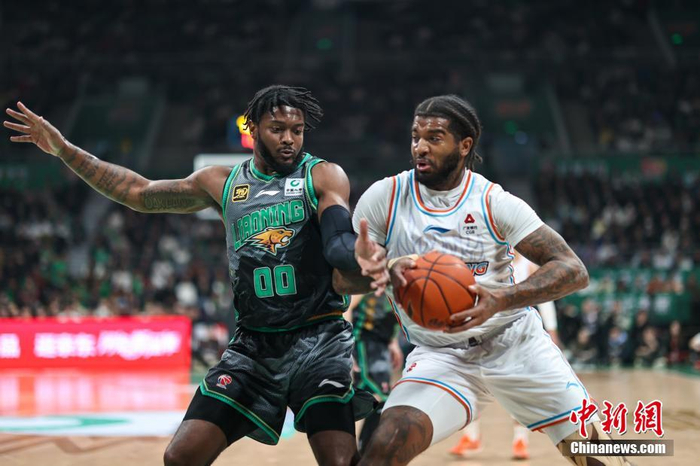 3月31日晚,在辽宁沈阳进行的2024-2025赛季中国男子篮球职业联赛(CBA)常规赛第四十六轮比赛中,辽宁本钢队在主场辽宁体育馆迎战山东高速队。最终,辽宁本钢队116:90胜山东高速队。图为辽宁本钢队球员奥利弗(左)在比赛中拼抢。中新社记者 于海洋 摄