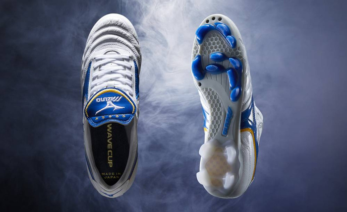 两款球鞋在配色方面基本相同,白面蓝标的设计既符合品牌风格,又显得简约清亮。同时将原本Wave Cup款的黄色设计换成了金色,更能显示出这双战靴的荣耀。