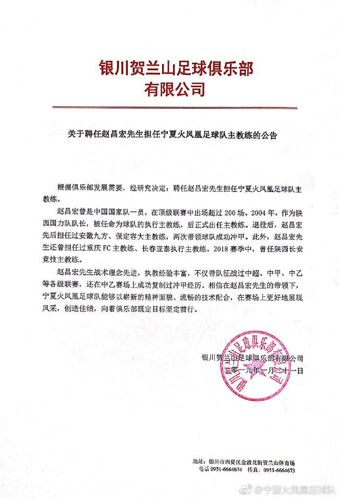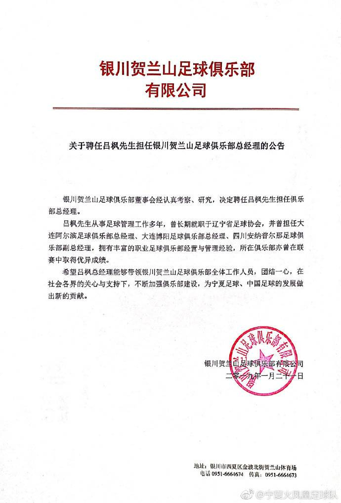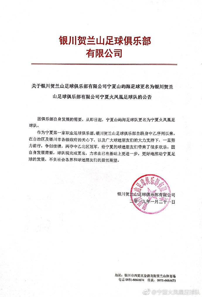更名公告中称,为了自身发展需要,球队现已完成更名,希望此举能更好地推动宁夏足球的发展。与此同时,吕枫成为俱乐部新任总经理,前国脚赵昌宏成为球队新一任主教练。