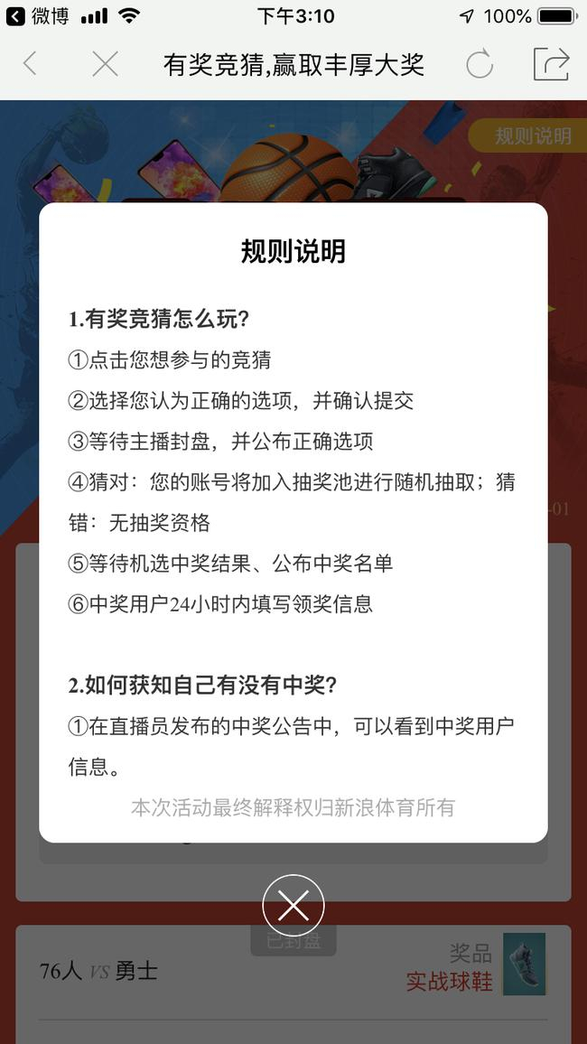 初一至初六,下载新浪体育APP,进入指定直播间参与有奖竞猜,每天将抽取一位幸运观众获得“春节大礼包”(NBA浪、台历、战靴),此外该中奖用户,还将获得赢取最后大奖的抽奖资格,在初七集结日将通过新浪体育微博账号直播,为幸运观众送出最后神秘“zhu”福大礼!
