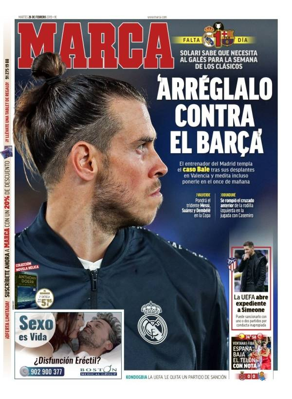 1、“在对阵巴萨前搞定它”,距离皇马主场与巴萨的国王杯半决赛次回合比赛还有1天的时间,皇马主帅索拉里意图搞定“贝尔事件”,他知道与巴萨的两场比赛需要贝尔的力量,他甚至可能明天将贝尔放入首发阵容。巴萨方面,巴尔韦德可能排出梅西、苏亚雷斯和登贝莱的三叉戟。