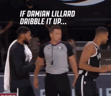 坦普尔在场边指导队友如何防守利拉德:“只要利拉德运球,你就去包夹他,我不管你漏掉的是CJ还是迈克尔-乔丹,你就去包夹他。球在他手上,他会从NBA(指中场Logo)那就投了。”