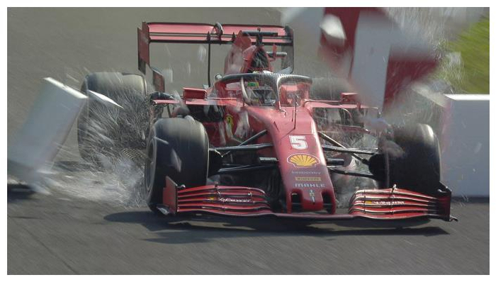先是维特尔的赛车在比赛第6圈遭遇到刹车故障,在比赛中是径直冲过T1泡沫塑料墙,德国人最终只能无奈开着毫无竞争力的法拉利赛车,回到维修区退赛。