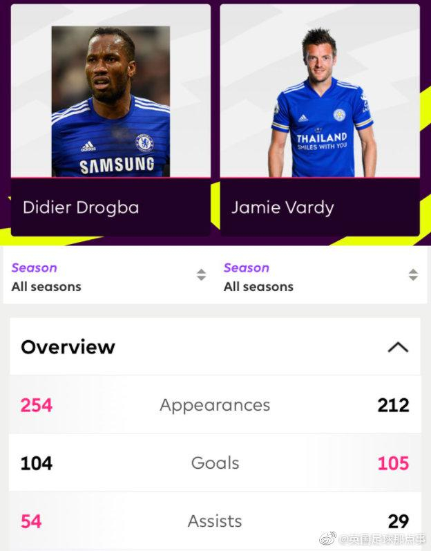 瓦尔迪本场梅开二度,英超进球数达到105球,超越德罗巴的104球,排名英超历史射手榜第27名