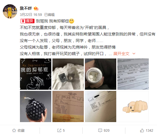 接下来该博主透露自己只是初三学生,并且患有抑郁症,表示自己不知道为什么因为一个外国人受到辱骂,还给武磊道歉,配图是治疗抑郁症药物: