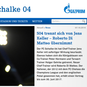 北京时间10月7日,德甲[微博]劲旅沙尔克04[微博]官方宣布,主帅凯勒下课,接替他的将是在2012年带领切尔西[微博][微博]夺取欧冠冠军的意大利教头迪马特奥。