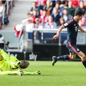 勒夫到场考察马尔勒。第20分钟,科曼右路切入禁区被德布拉西斯伸腿绊倒,点球!穆勒主罚支撑脚发软打飞!自己也倒在地上[点击观看视频]。美因茨第28分钟首次制造威胁,武藤嘉纪左路切入禁区距门13米处低射打在边网上。随后科斯塔禁区边缘扣到左脚大力抽射被卡里乌斯托出横梁。