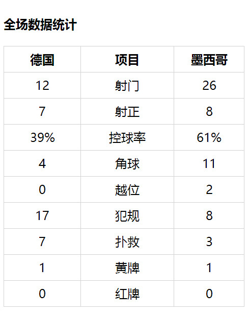 墨西哥第75分钟几乎扳回一分,洛萨诺禁区左侧接应过顶球凌空垫传,希门尼斯前点距门8米处头球击中远端横梁!布兰特和尤尼斯先后登场,换下施廷德尔和德拉克斯勒。基米希接任队长。墨西哥第89分钟打进安慰球,埃姆雷-詹勾倒马克斯,埃雷拉快开任意球,法比安在门前32米处抽射打出外旋弧线球入右上角,1比3。补时第1分钟,基米希右路直传,韦尔纳禁区右侧距门12米处左脚射门被封堵,布兰特横敲中路,埃姆雷-詹再转移,尤尼斯左侧小禁区角上左脚推进远角,4比1。