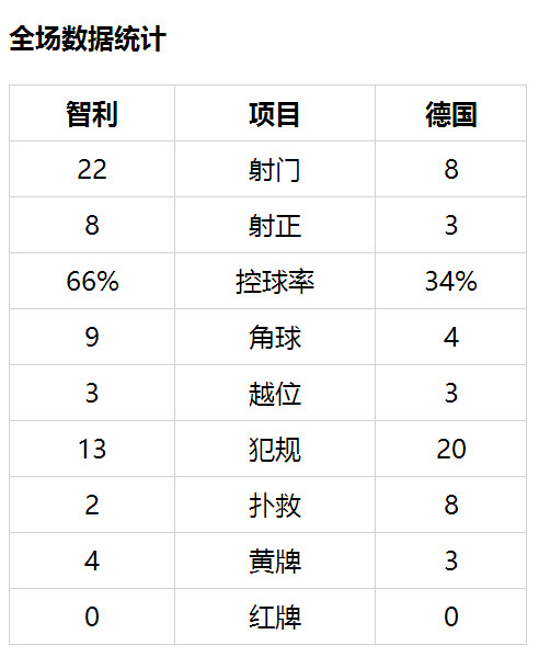 德国第15分钟才有首次射门,德拉克斯勒右侧开出角球,穆斯塔菲在门前10米处争顶高出。智利任意球配合,迪亚斯禁区左侧做球,伊斯拉左脚小角度打偏。随后比达尔在门前25米处抽射造成特尔施特根脱手,桑切斯左侧跟进没有把握补射机会!