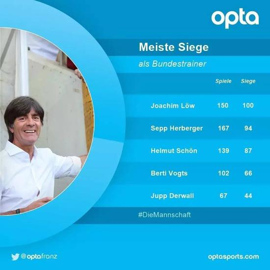 1. 他是德国队历任教练执教胜率最高的,达到66.7%,排名第二的德瓦尔也只有65.7%。