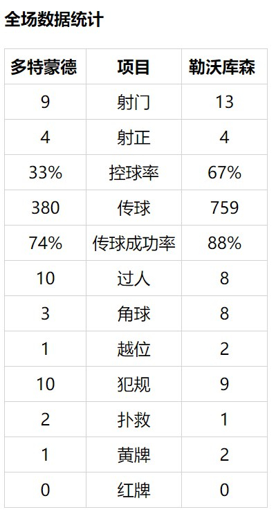上半时多特控球率仅有31%,自2004-05赛季进行相关统计以来,多特德甲主场全场控球率从未如此之低。多特下半时首次射门就扩大比分,阿什拉夫右路低传,对方前点解围失误,格策禁区边缘推射入左下角,3比1。随后迪亚洛中路直传,帕科趟过出击的赫拉德斯基,禁区左侧推进空门,但主裁判听取VAR意见后认定越位,进球无效。