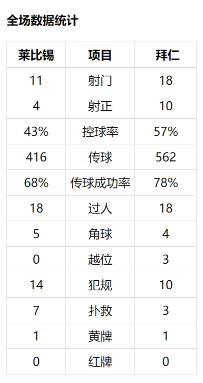 国际足联主席因凡蒂诺观战。拜仁开场3分钟首次射门,莱万传球,格纳布里右路切入禁区左脚射门偏出。莱比锡第11分钟险些破门,哈尔斯滕贝格左侧开出角球,波尔森前点距门5米处头球被诺伊尔单手一托击中横梁下沿弹回!