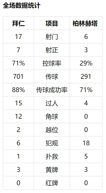 上半时柏林赫塔3次射正打进2球。下半时,格纳布里左肋直传,科曼突入禁区小角度射门被亚尔斯坦铲出。